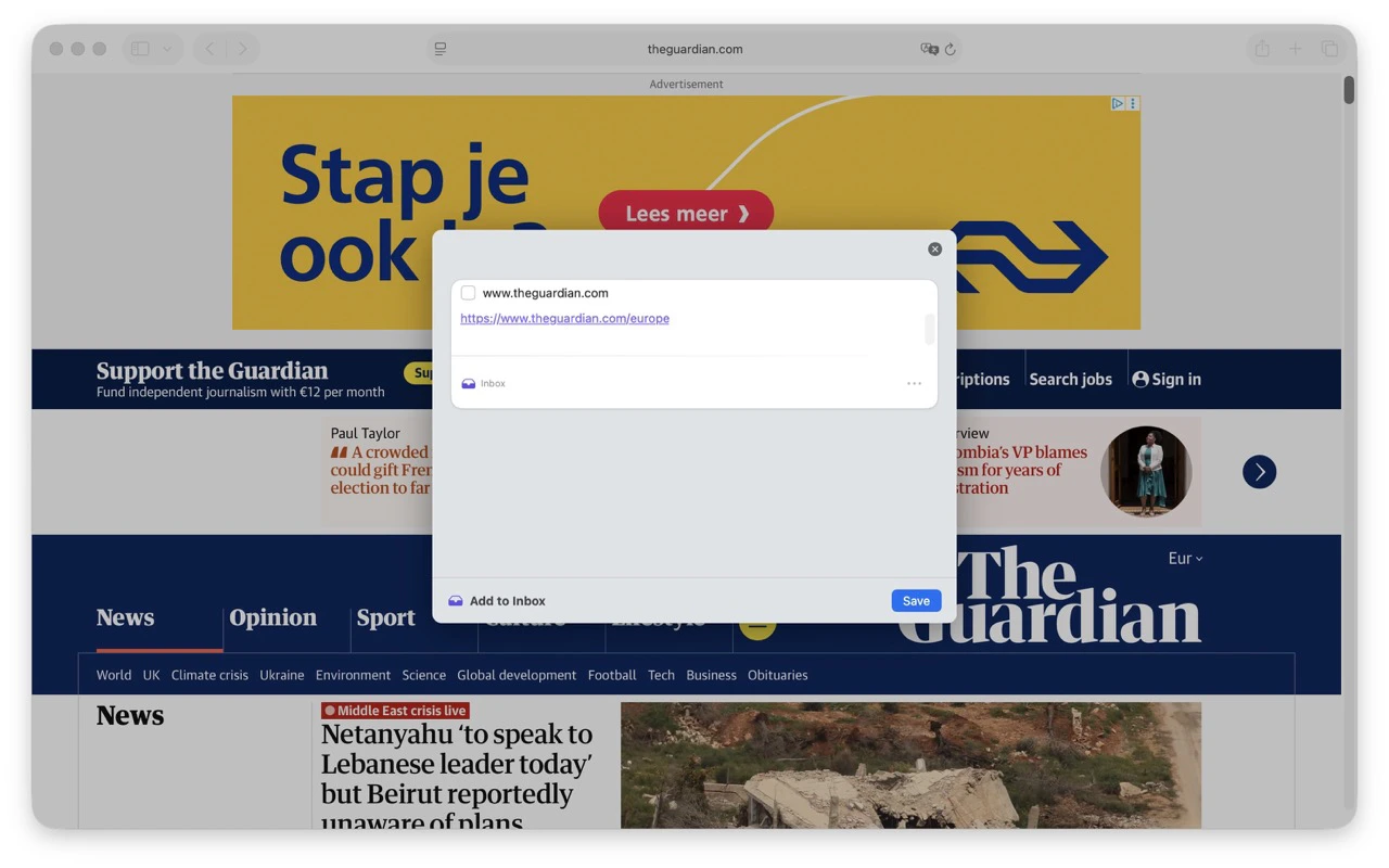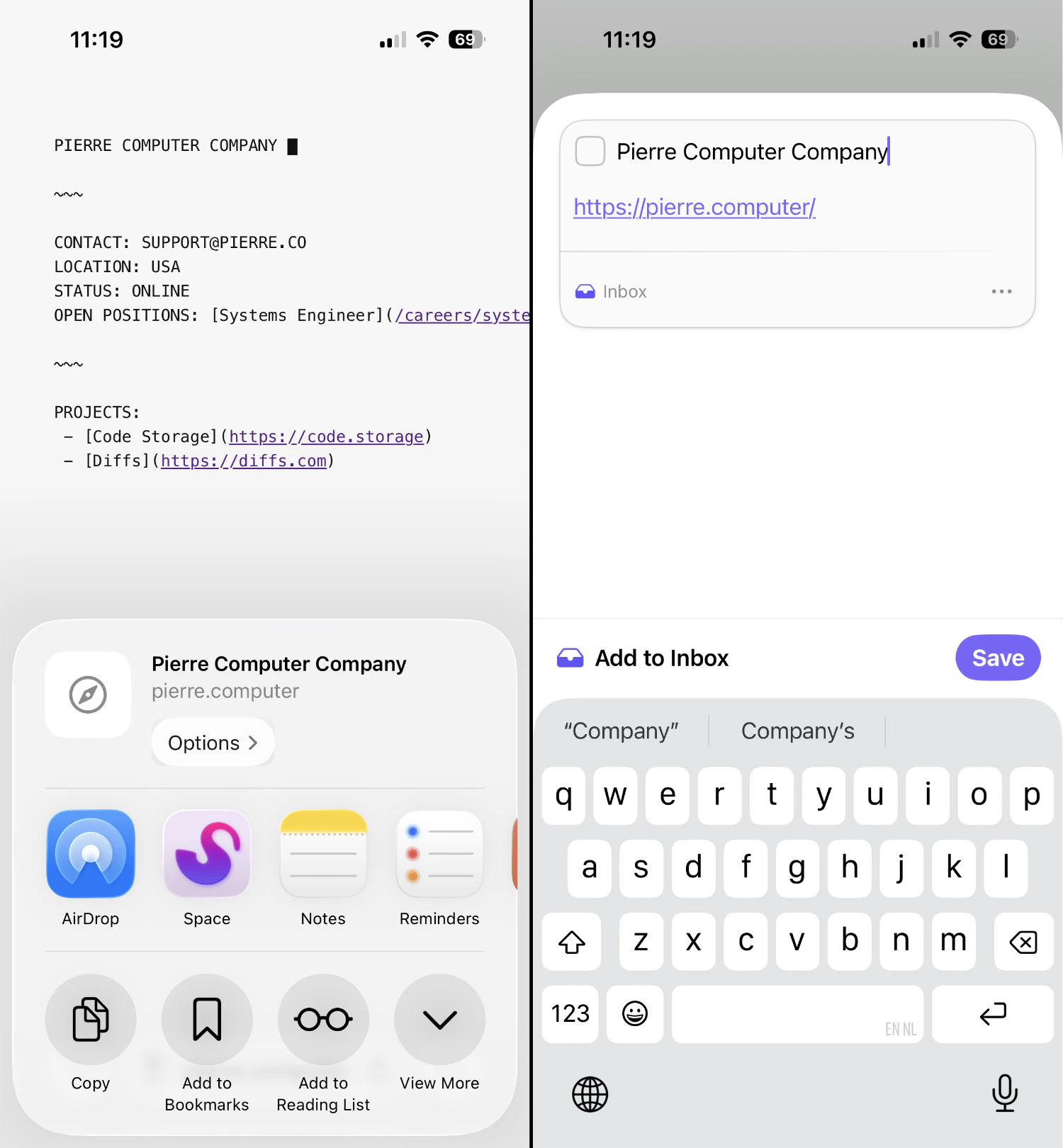 On iOS things are a little easier since we don’t need to enable the extension; it is always on. Just open an app that supports sharing, tap the share icon, and find Space in the list of apps. When Space is not shown immediately, tapMore and look for Space in the resulting list.