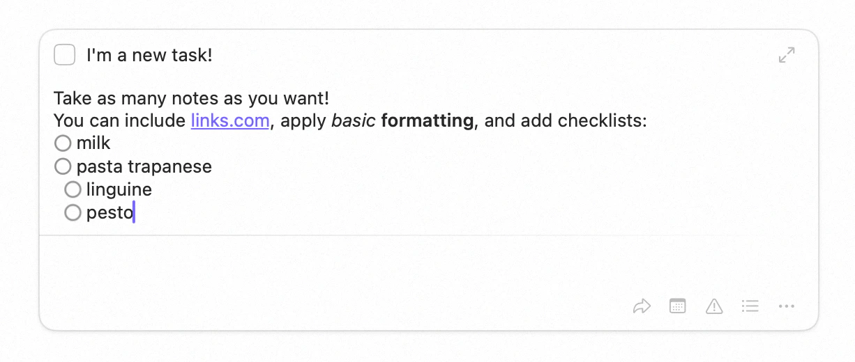 To begin editing a task, simply double click it (or tap it on iOS). Or select it with the arrow keys and press Return. You can then type away. The buttons bottom-right allow you to take quick action on the task: move it, schedule it, or many other actions via the … menu.